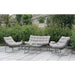 This contemporary outdoor patio set is all about comfort. The seating is contoured and cups you in soft padded tufted cushioning. The framing is minimal and does away with the solid sides typically found in patio sets. The glass top tables sit at a height where you won't need to bend while seated in order to reach your dink. It's going to be hard to get back up when you're being cradled like this.