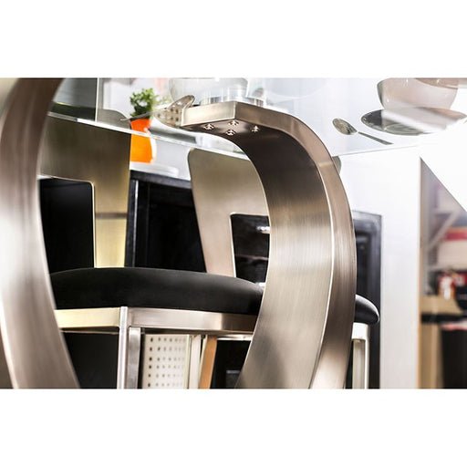 NOVA Satin Plated/Black Sofa Table, 45"L X 18"W X 28 3/4"H, 54.8lbs. Add a modern artistic air to your living space with this living room tables set, showcasing tempered glass table tops supported by unique twisting pedestals. Features: Contemporary Style 8mm Beveled Tempered Glass Top Twisting Pedestal Metal, Others Satin Plated Finish