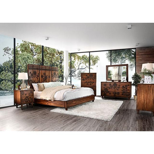 FOA WestA warm, wire-brushed finish and plank-style aesthetics give this mirror and the Amarillo set a cohesive look.